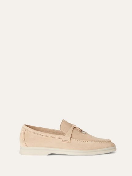 Suede calfskin sandal with framed strap and tonal stitching featuring Loro Piana My Charms charms. Luxurious and elegant, it is