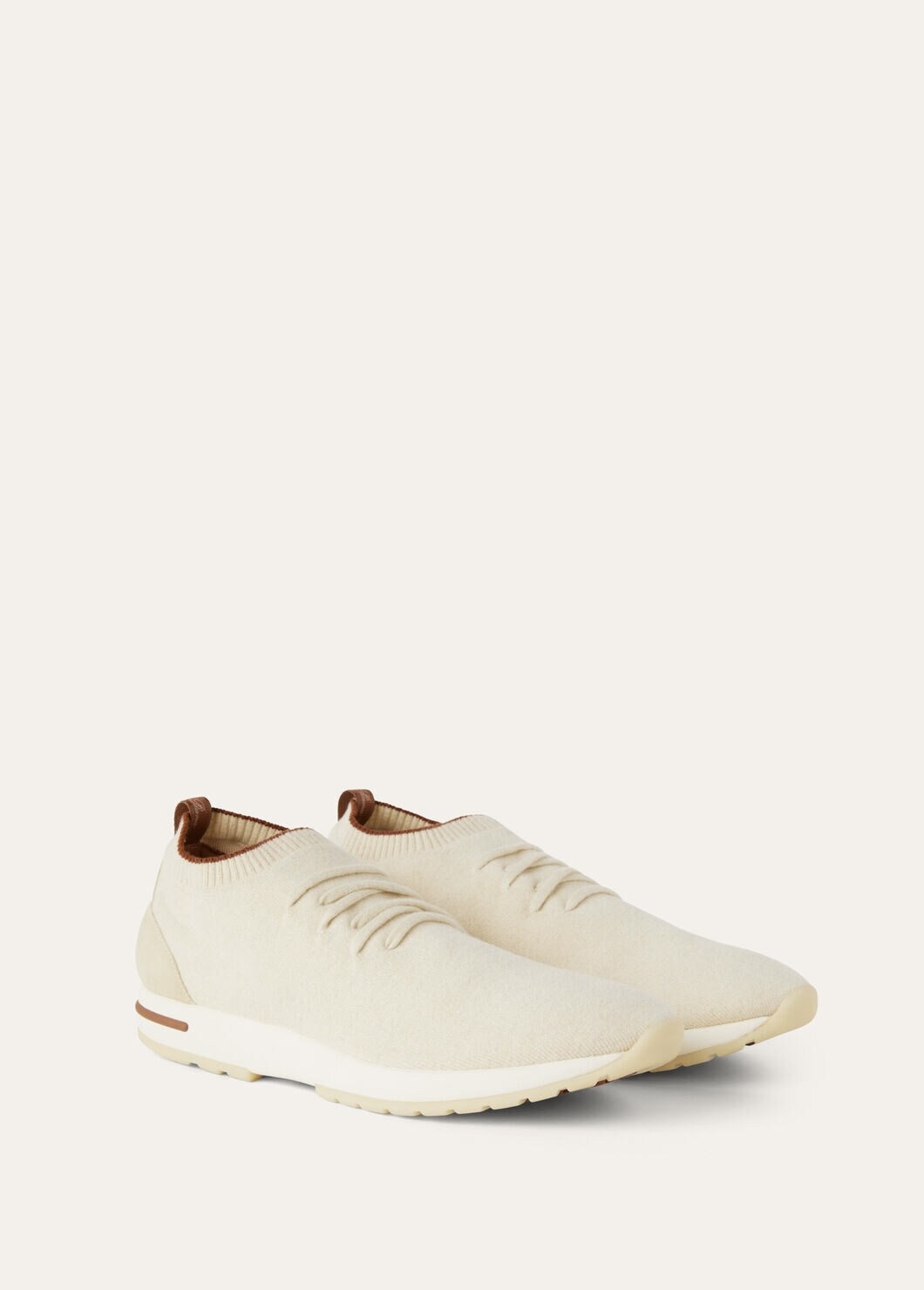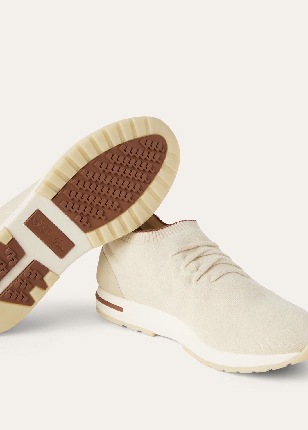 Combining cutting-edge technologies with a commitment to sustainable fashion, Loro Piana creates a capsule collection of garments made from high-quality recycled cashmere. The 360 LP sneaker features a hand-crafted construction on knitted looms made from recycled cashmere knit fabric: a new blend of fibres from carefully selected garments that have been completely unraveled, with a percentage of virgin fibres added. This unisex model, which can be freely combined and kept forever, is light and flexible, and the design is completed with sporty, tasteful leather inserts. White sole with camel tread and Loro Piana initials repeated